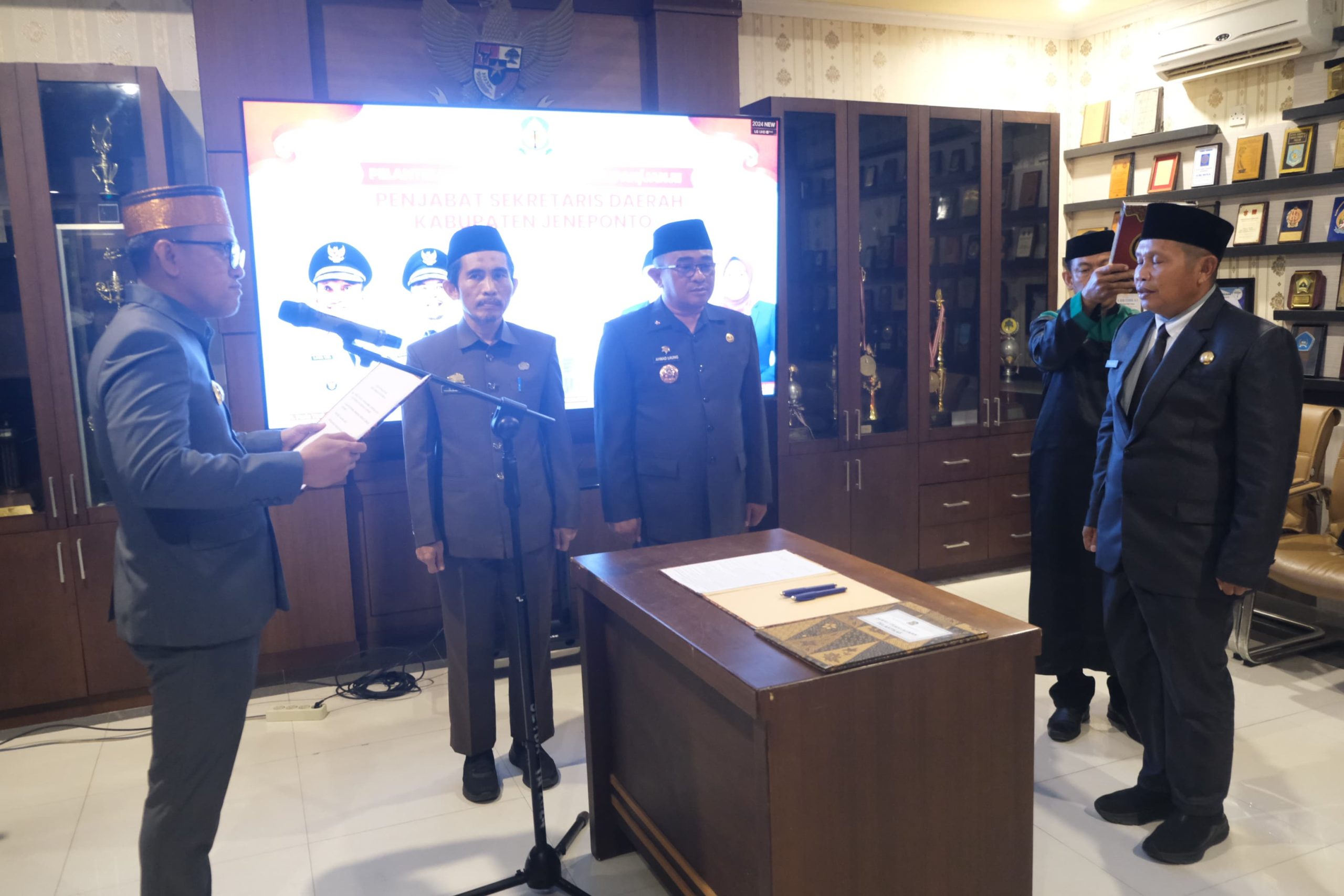 Bupati Jeneponto H. Paris Yasir melantik Pj Sekda Maskur SAg MH CGCAE di ruang rapat bupati Jeneponto.